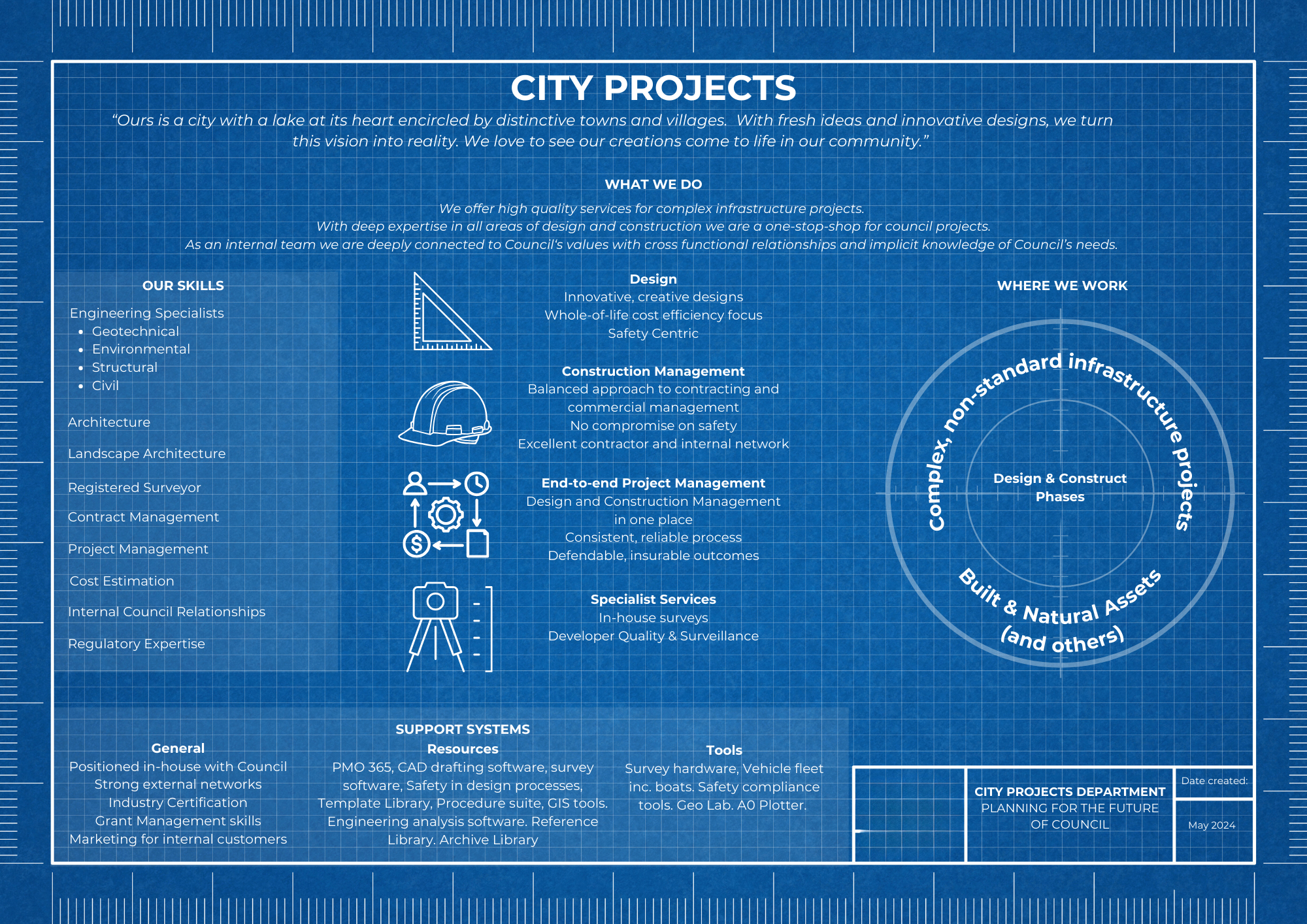 CITY PROJECTS STRATEGY. I collaborated with a City Projects team through a series of workshops to clarify their core capabilities and how they contribute to council’s key value areas. This process helped identify their target customers and the support they required, creating a clear vision for prioritizing high-value projects for both the team and the council.